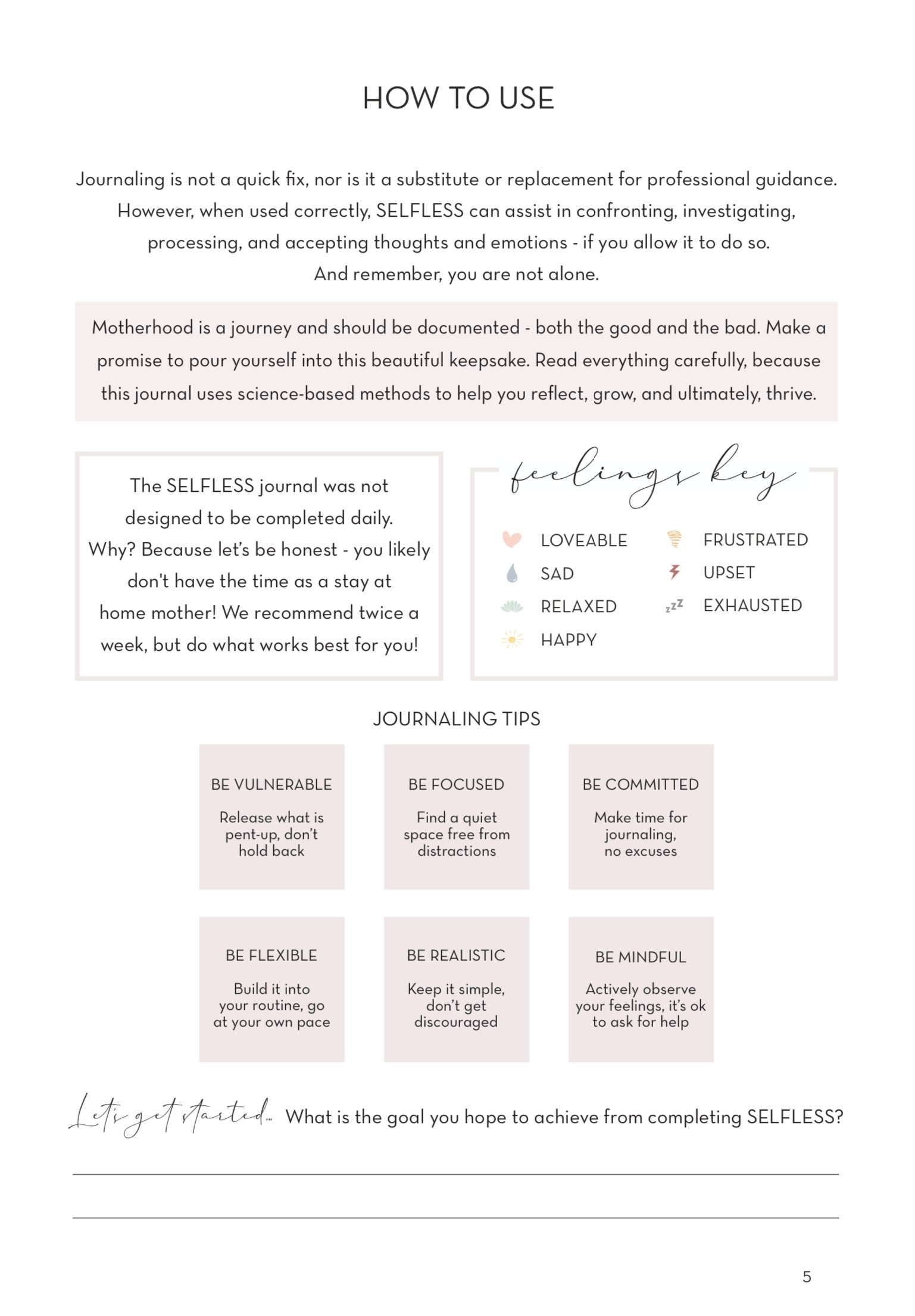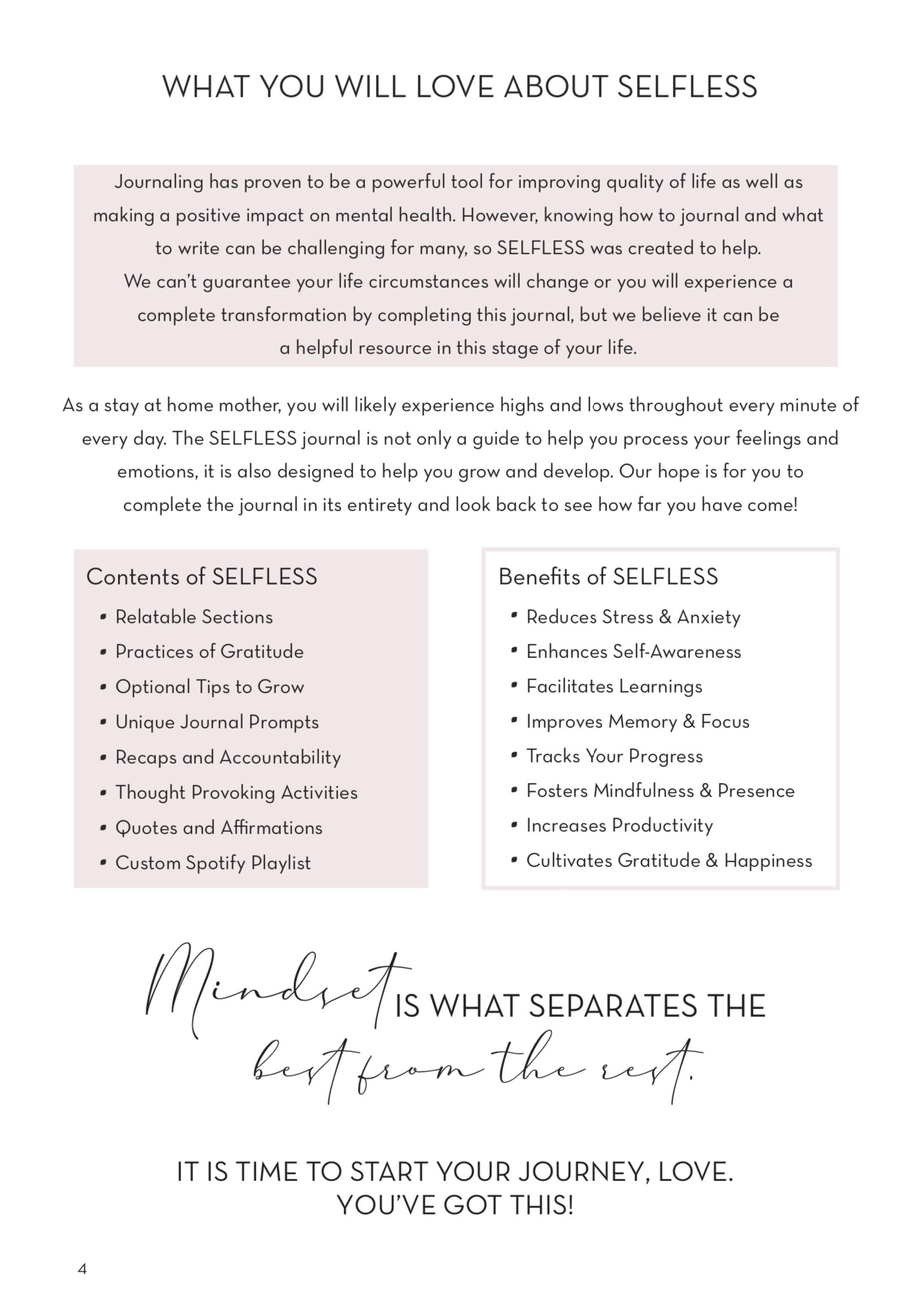 SELFLESS is the #1 growth and development journal for stay at home mothers seeking validation, courage, and support. This journal is ideal for women with children under the age of 7. It was designed to help stay at home mothers navigate the ups and downs of being home to raise a family. Selfless is an undated journal with 12 relevant sections with unique prompts, reflection, tips to grow, daily gratitude, mood tracking, and so much more!